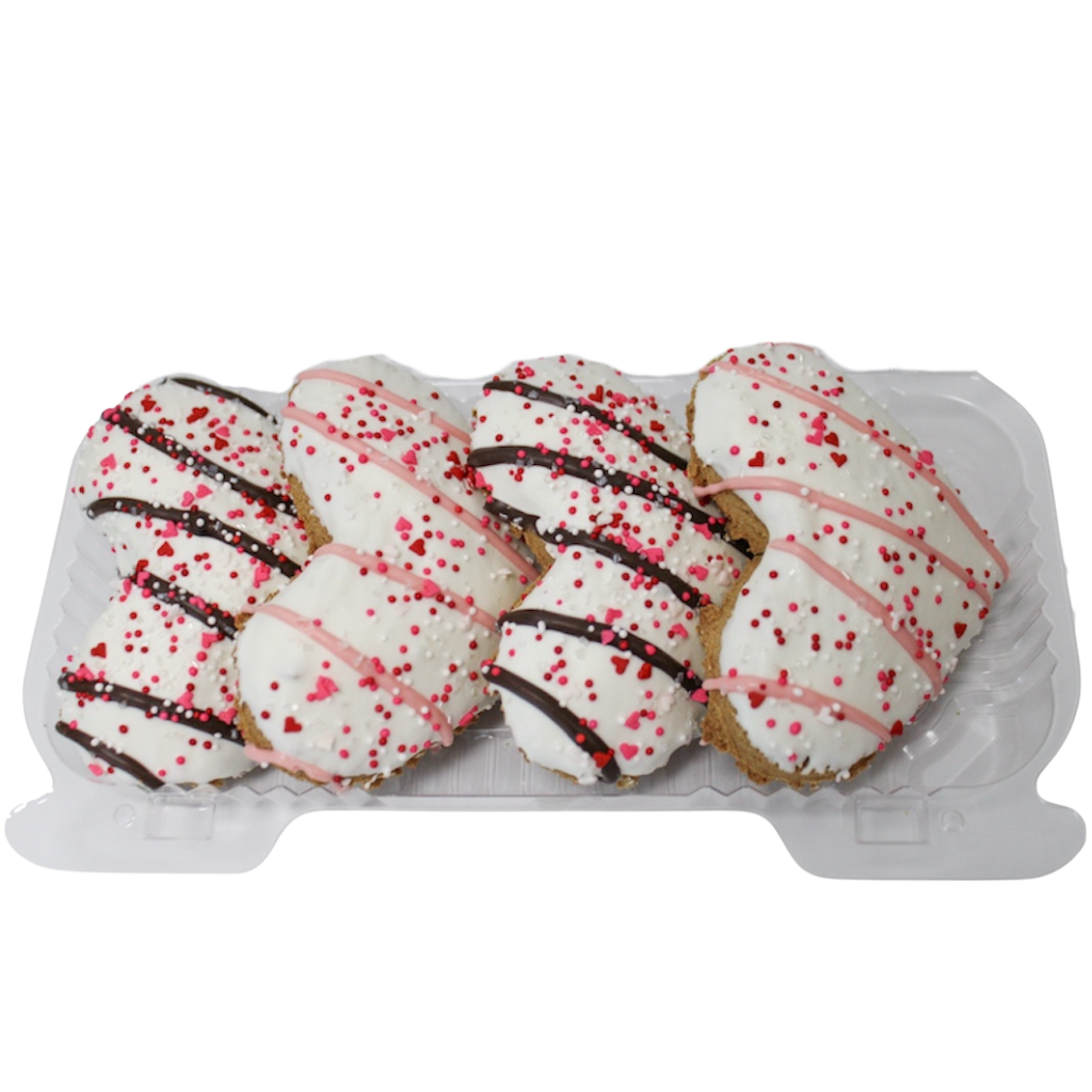 The newest addition to our Bakery is the 3" Jumbo Heart Shaped Cookie, 4 pack. This adorable cookie is hand dipped in our house yogurts and seasonally decorated for the one you love. A simply must have!