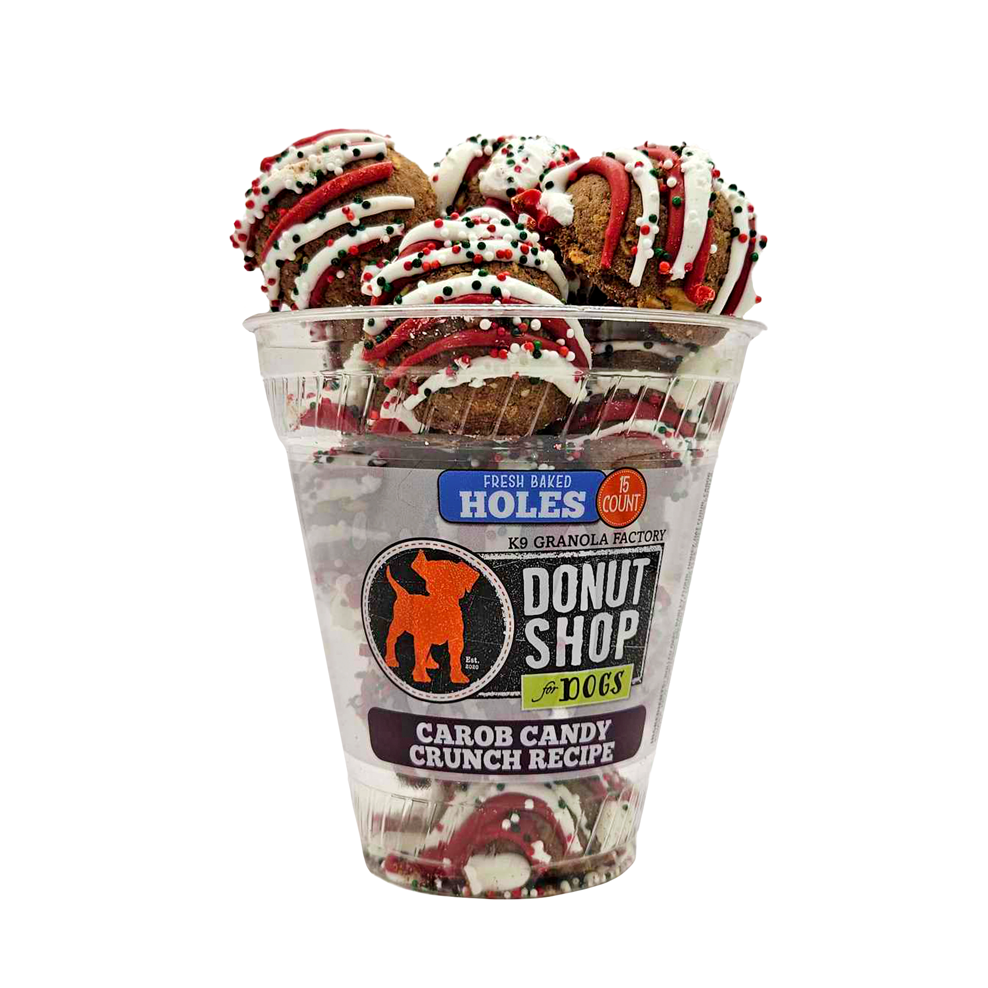 Sweet, colorful, and a WHOLE lot of fun... K9 Granola Factory Christmas Donut Holes are the perfect stocking stuffer for your canine companion. Made with our signature gourmet granola, these bite-size holes are drizzled with our delicious house-made yogurt and then topped with colorful sprinkles. One parfait cup holds 15 individual holes, making this the perfect size for snacking.